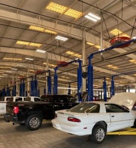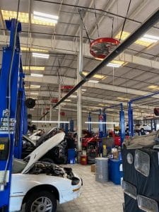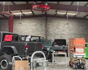 At Super Duty Fans, our niche is walking into busy factories, warehouses, and hot buildings that need significant air movement but don’t have the physical space for fans to work around obstacles. Vehicle repair shops are no different. Cars and trucks will be everywhere in any given auto body shop. Various cords, cables, tables, oversized lifts and diagnostic machines, tools, equipment, and pipes also run from the ceiling to the floor.