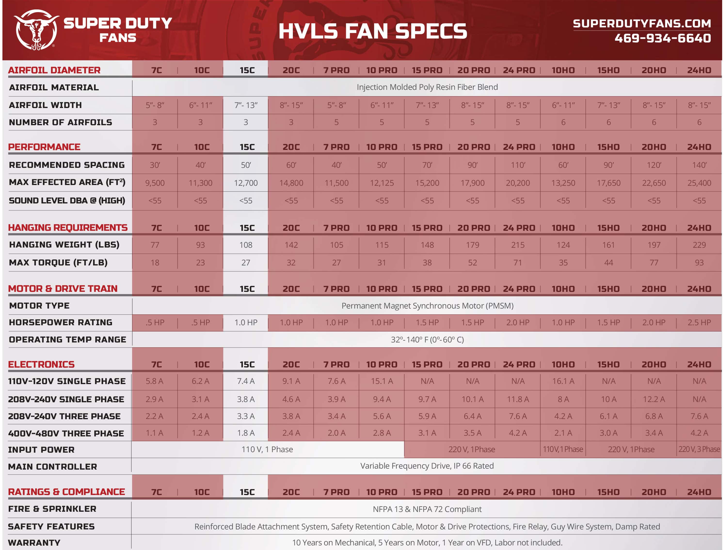 This efficient 15’ fan moves more air with 3 blades than other fans with 5 blades, thanks to the innovative blade design and high-torque 750 watt motor.  The included VFD uses standard 110V input and provides speed and direction control, as well as converting the voltage to 220V 3 phase to the fan motor for efficiency.